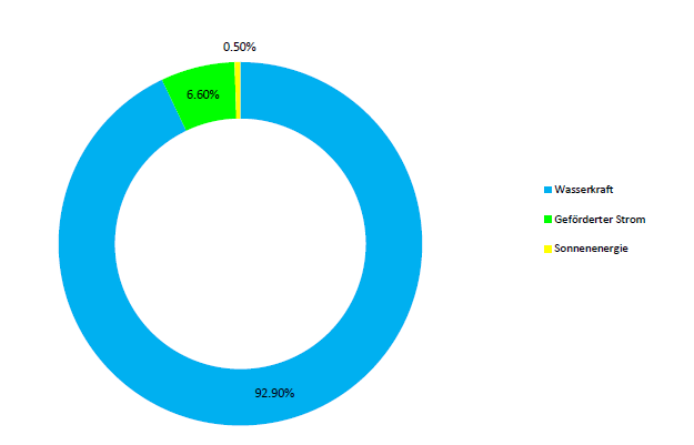 Geförderter Strom: 58.5% Wasserkraft, 14.92% Sonnenenergie, 4.1% Windenergie, 19.1% Biomasse, 3.4% Siedlungsabfälle erneuerbar, 0% Geothermie